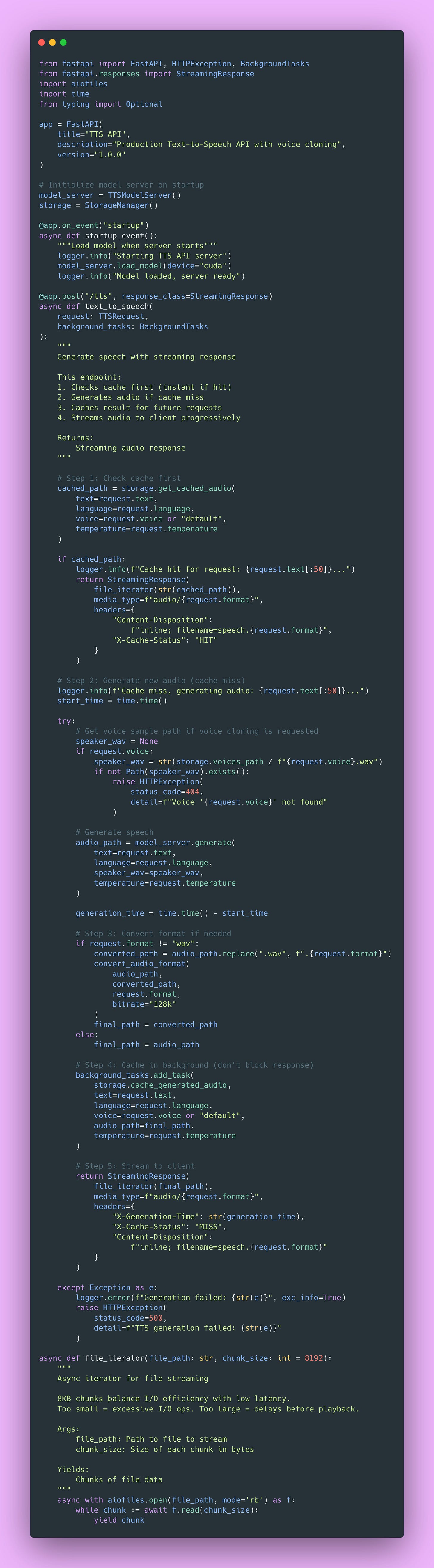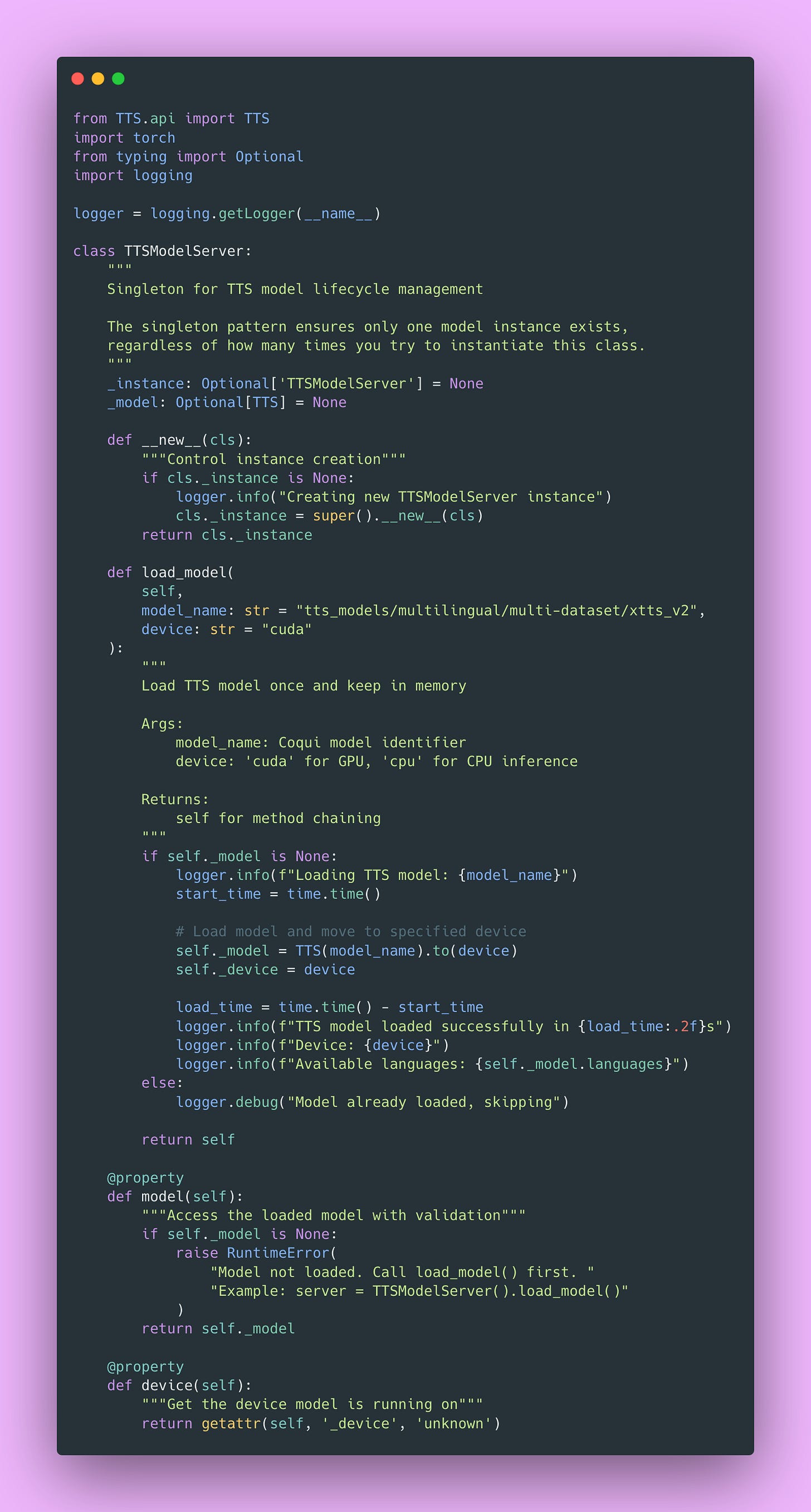 The singleton pattern uses Python’s __new__ method to control instance creation. Every time you call TTSModelServer(), you get the same instance. The model is loaded once on first access and reused for all subsequent requests.