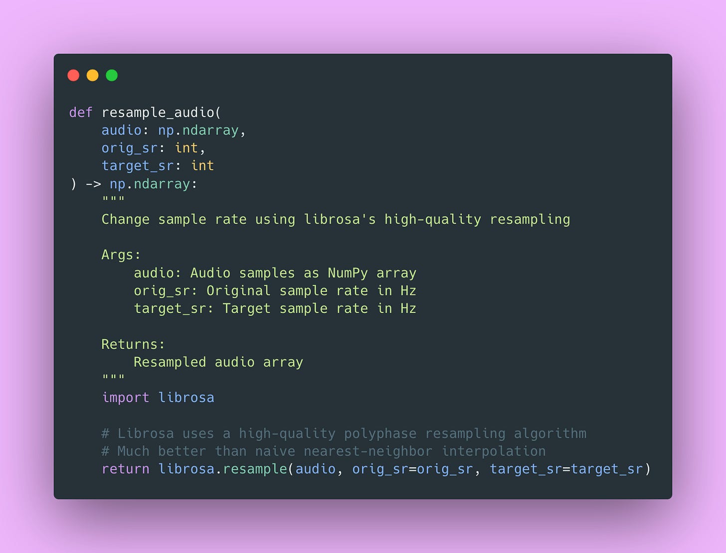 The implementation looks simple, but librosa does the heavy lifting behind the scenes. It uses polyphase filtering, which is a sophisticated resampling algorithm that avoids aliasing.
