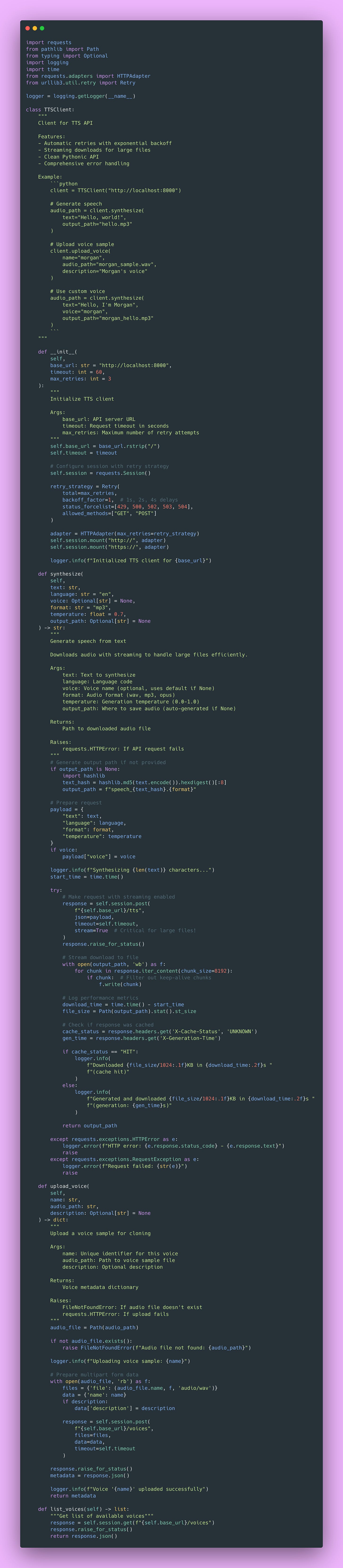 This structure separates concerns cleanly. Audio processing lives in audio.py, model inference in model.py, storage management in storage.py. FastAPI handles HTTP in main.py, Pydantic validates inputs in schemas.py, and the client library in client/ provides a clean interface for users.