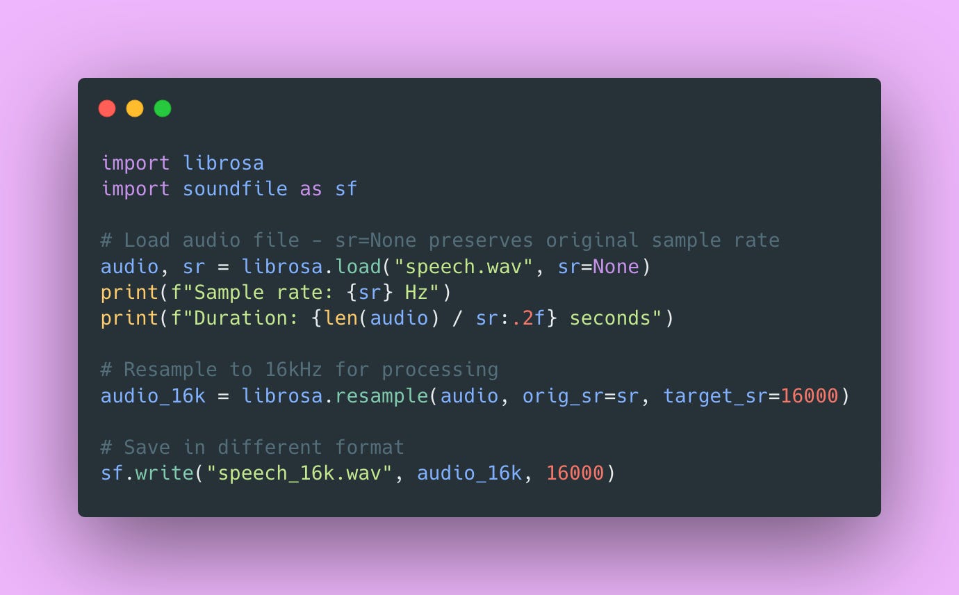 The sr=None parameter in librosa.load() is important. It preserves the original sample rate. If you omit it, librosa defaults to 22050Hz and resamples your audio automatically, which might not be what you want.