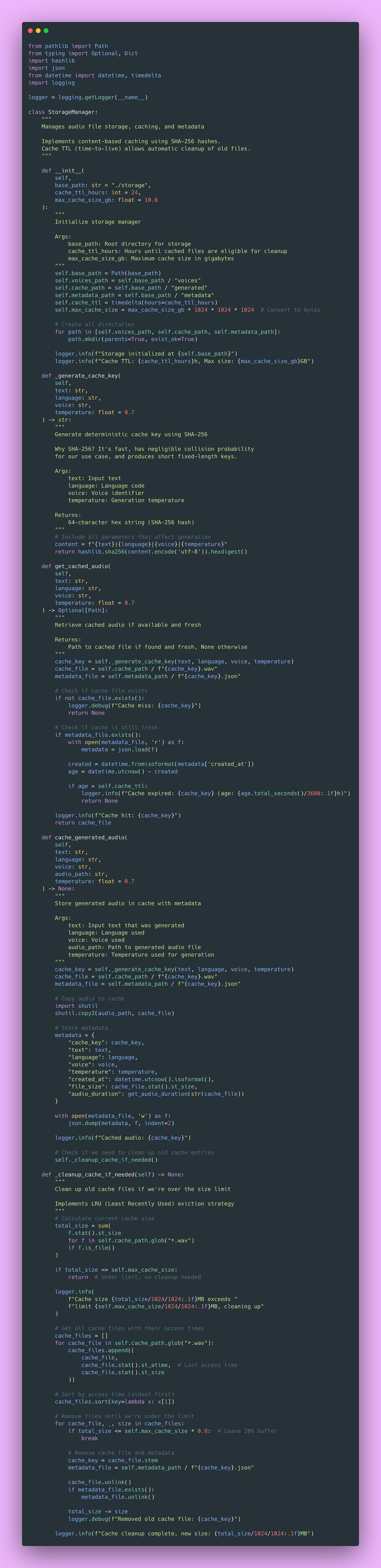 This caching system saved me a fortune in compute costs. The LRU (Least Recently Used) eviction strategy means popular phrases stay cached while rarely-used ones get cleaned up automatically.