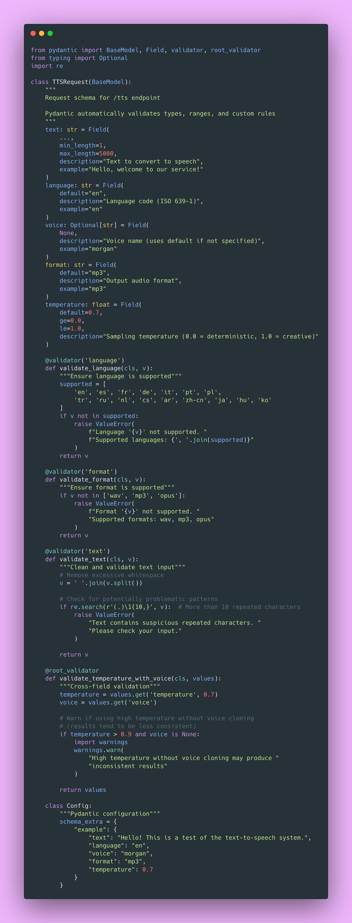 This validation layer has saved me countless debugging hours. Users sometimes send the wildest inputs. Empty strings, 50,000 character novels, random binary data misidentified as text. Pydantic catches all of it before it hits my model.
