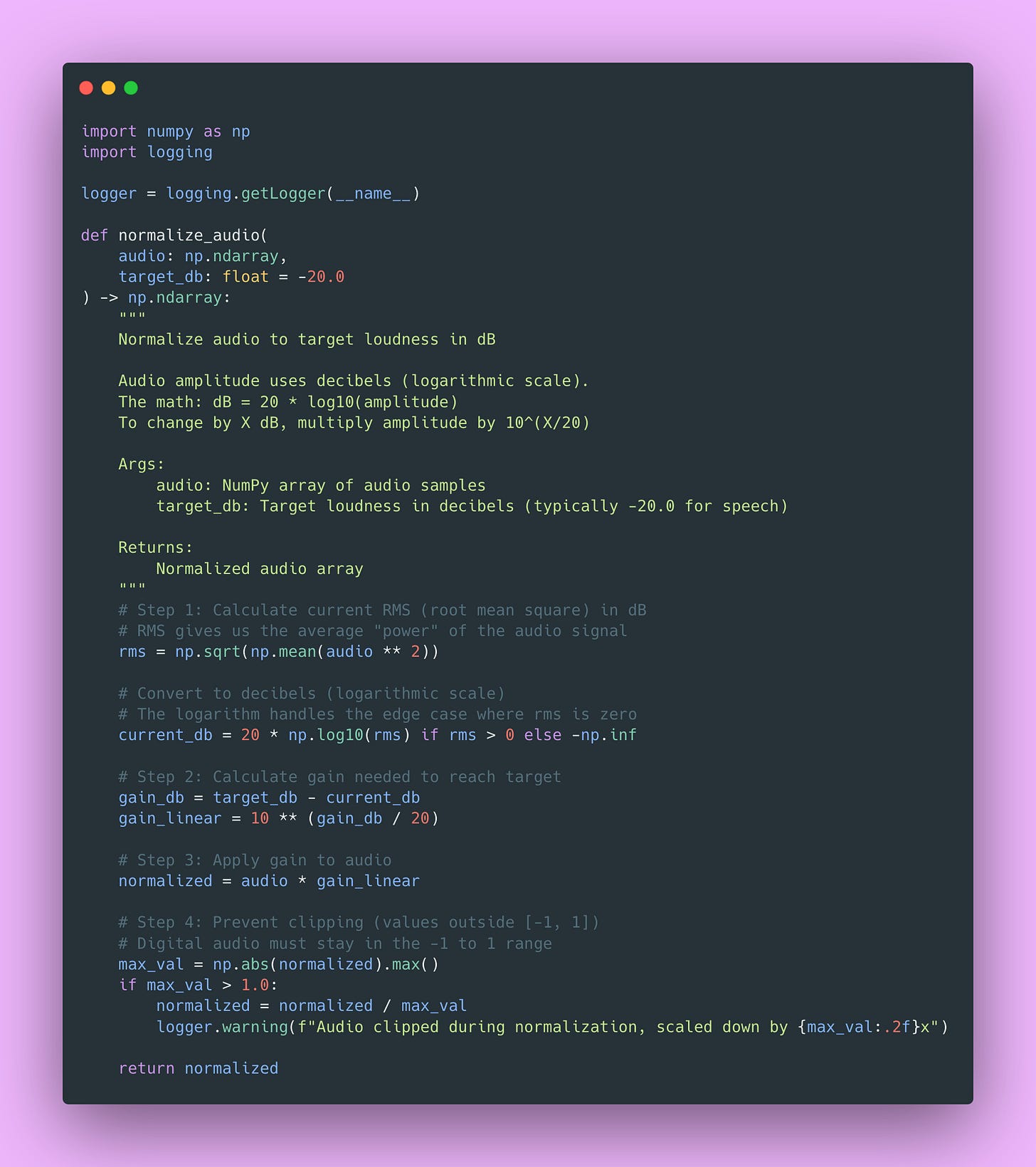 User-uploaded voice samples have wildly different volumes. Some people record super quiet, others are basically YELLING into their microphone. Training on inconsistent volumes confuses the model, and generation produces unpredictable loudness that makes your API feel buggy.
